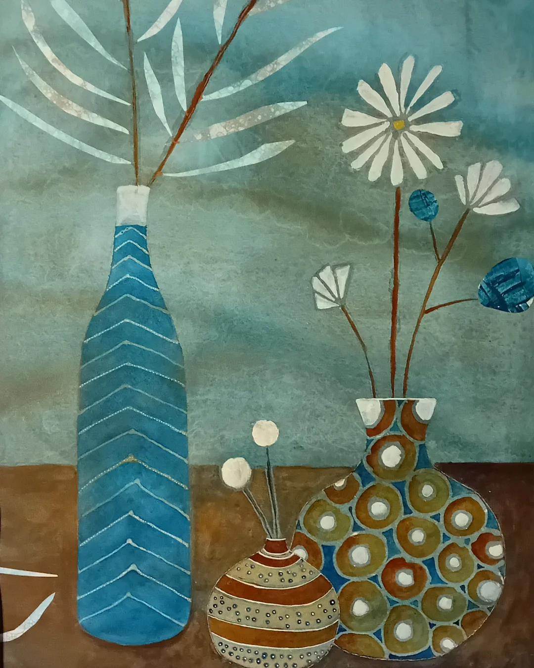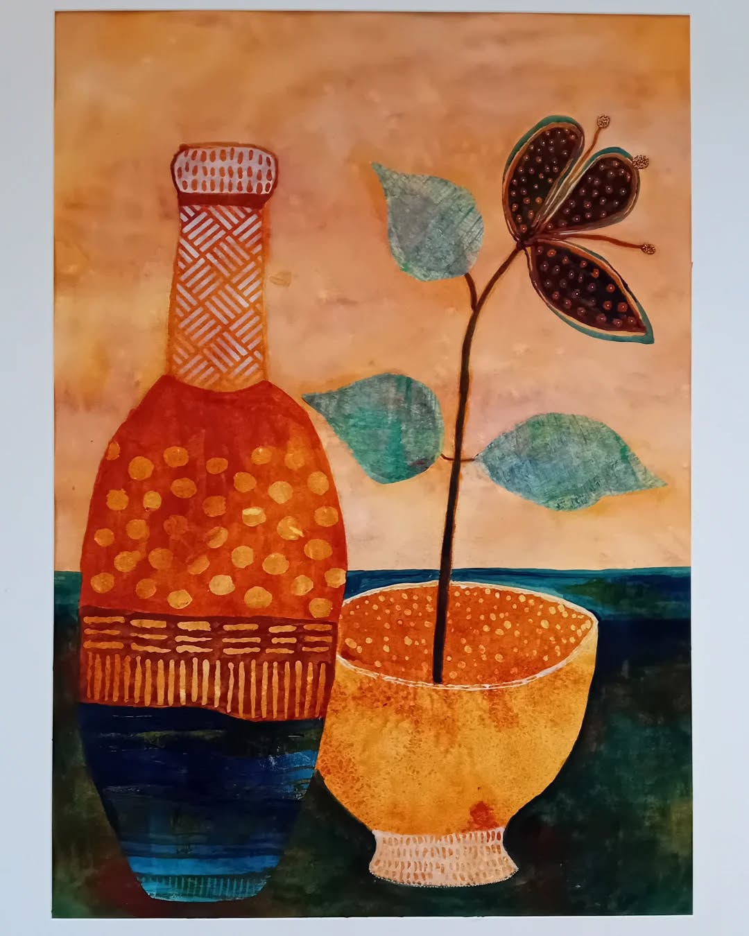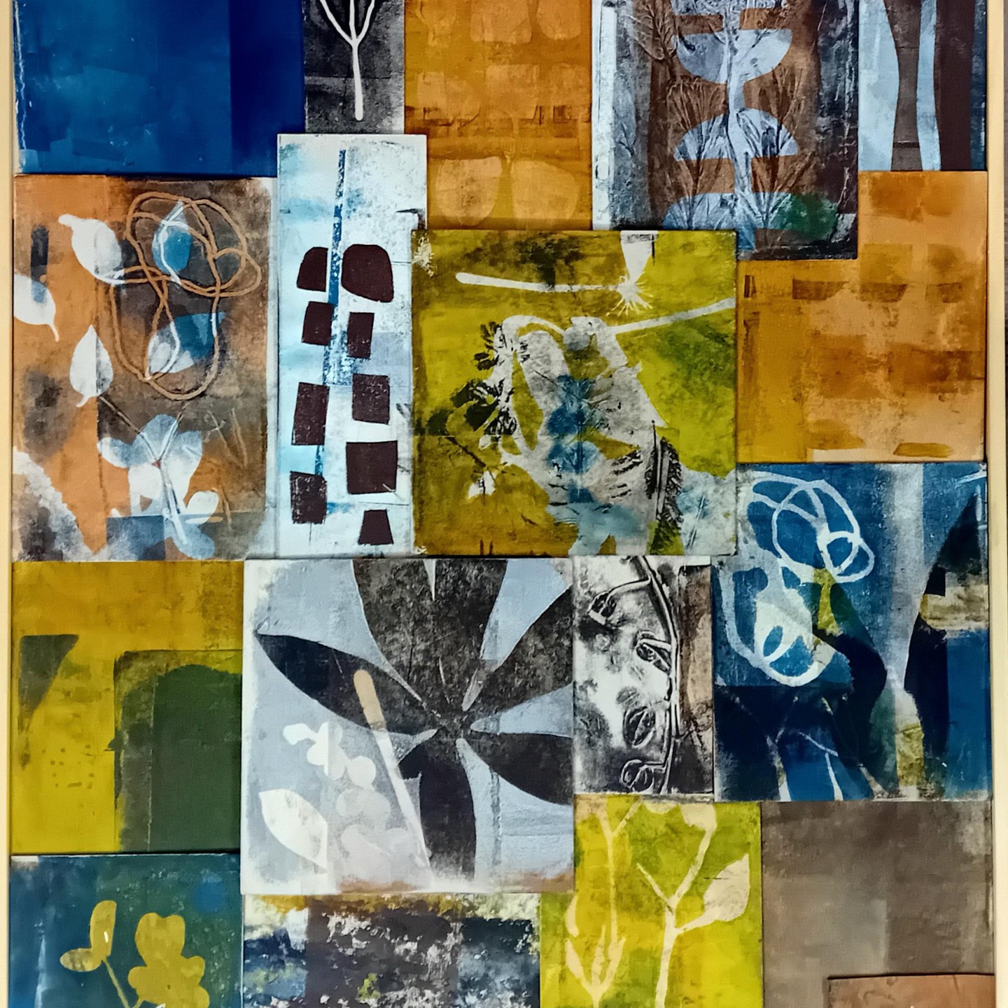 In een dag-workshop van 10:00 tot 15:00, waarbij we niet op een half uurtje extra kijken, leer je de basisvaardigheden van het mono-printen. Met de prints maak je vervolgens een mixed-media werkstuk op een 30×30 cm. mdf plaatje.